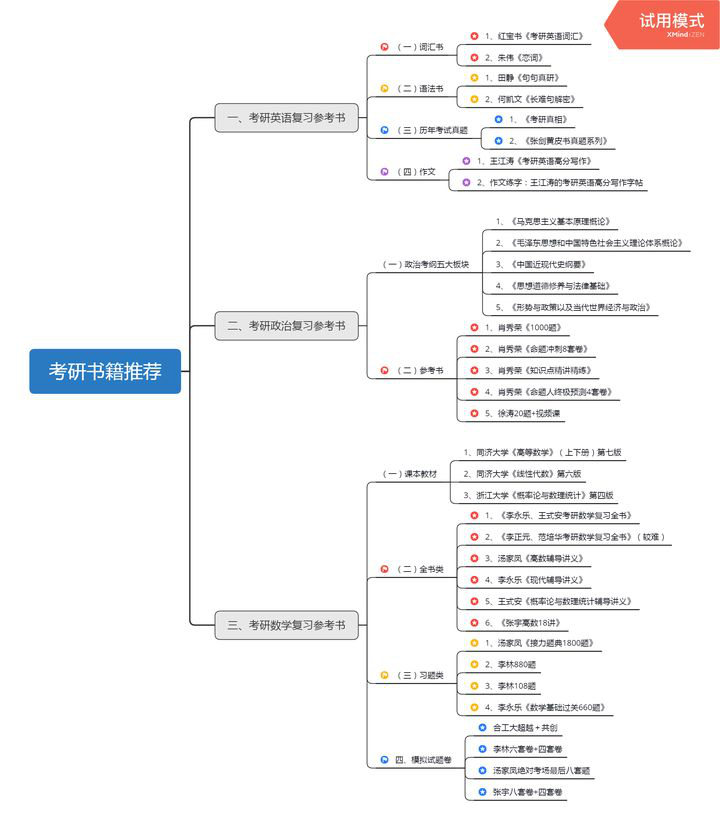 考研复习首先要考虑的就是如何挑选各个阶段的复习参考书,以下是英语数学政治三科全程复习的常用参考书推荐,英语的参考书词汇、语法、真题2选一,政治的五本都需要。