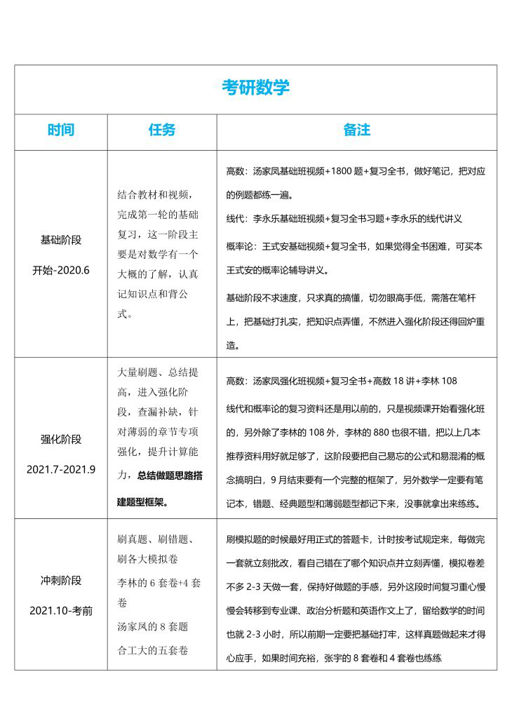 6、学会拆解目标,把目标院校分数线拆解到各科,再根据各科目标安排学习进度,比如我数学目标分是110,那我就需要思考该如何复习才能达到这个目标,然后把目标细分,1-4该把基础定义都搞懂,5-7月就要进入第二轮强化阶段,8-10考试练习历年真题……,