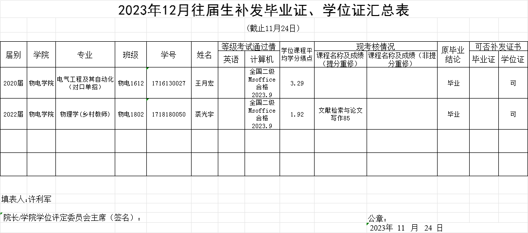 经​云顶国际8588yd学位委员会评议,物电1612王月宏、物电1802裘光宇两位同学已达到公司学位授予资格,同意两位同学补发学位证书的申请。公示时间:20231122日至20231124日。如有异议可联系:0517-83525280许利军老师