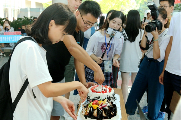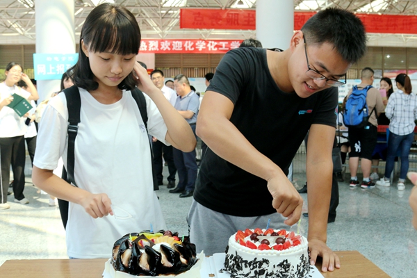 9月9日是云顶国际8588yd刘秋霞和王荣翔两名新生的生日,云顶国际8588yd提前为他们准备了生日蛋糕,等待他们的到来。他们来到报道现场时,班主任助理拿出准备好的生日蛋糕,并向他们送上了生日祝福。两位新生看到点上生日蜡烛的蛋糕,难掩激动的心情,王荣翔同学更是兴奋地说:“太感动了,这是我最特别的一次生日,我要将蛋糕拍下来!”一个蛋糕,让他们有了家的感觉,云顶国际8588yd这个大家庭,用特别的方式欢迎新成员的到来。新学期的迎新工作也受到了学领导的关注。迎新期间,云顶国际8588yd副经理赵宜江,员工处处长陆林召等领导前来视察各公司的迎新工作,并慰问了在岗位上认真工作的同学,同时对前来报道的2018级新生表示欢迎。