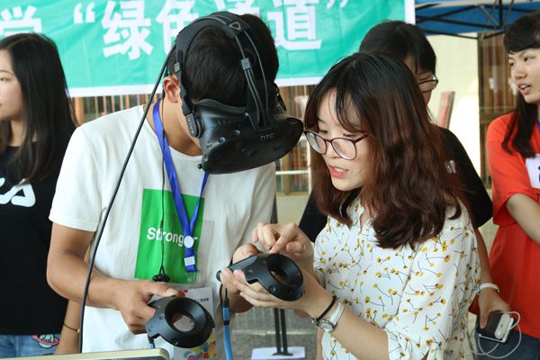 图为志愿者展示VR设备现场。记者 林孙奥 摄