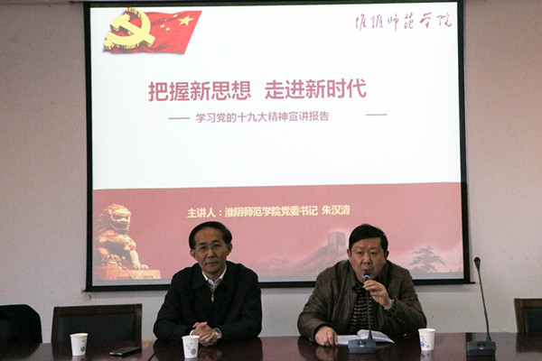 为深入学习贯彻党的十九大精神,12月6日下午,淮阴师范公司党委书记朱汉清到​云顶国际8588yd为师生党员作题为“把握新思想 走进新时代”的党的十九大精神宣讲报告。