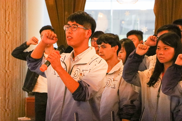 各环节中,又以誓词宣读部分最为震撼人心。在场全体起立,右手握拳置于耳旁,在1601班班长金晨的带领下,重温入团誓词。“我志愿加入中国共产主义青年团,坚决拥护中国共产党的领导,遵守团的章程……”团旗之下,庄严的誓词声声铿锵,震人肺腑,满是同学们青春的热情,与对国家、对党的信任和骄傲。