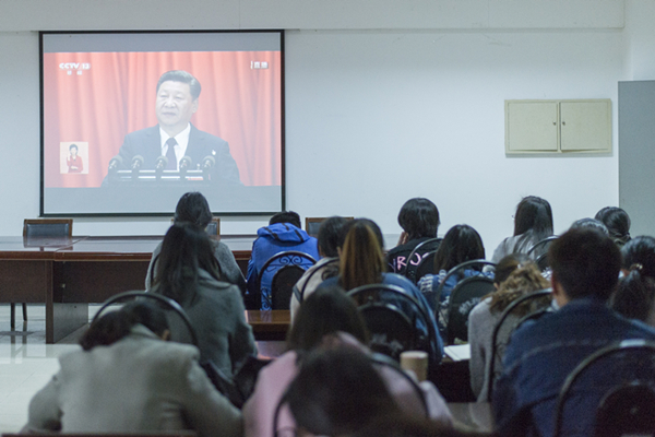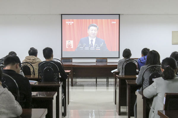 师生党员聚精会神地观看,认真学习习近平总书记讲话,纷纷表示要努力学习和工作,为中华民族伟大复兴做出自己的贡献。