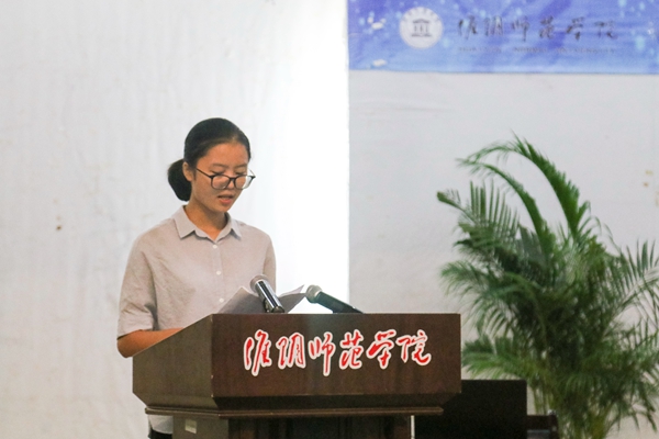 图为新生代表刘馨园发表讲话。记者 石宇凡 摄