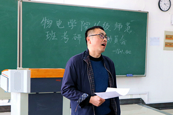会上,刘仁明1601、1602两个班的考研工作进行了动员,着重强调了考研的重要性和注意事项。针对两个师范班性质的不同,刘仁明分别为两个班级分析了当下考研的现状,提醒同学们要认识到当今社会的严峻形势。同时,刘仁明指明了物电学子的长处优势,并向同学们讲述了往届学长学姐考研的励志经历,引导同学们端正态度、明确目标,用信心、恒心、决心和平常心积极面对考研。会议最后,刘仁明表示,同学们要尽早做好考研的准备,在制定明确目标计划的同时,进行正确的自我定位,选择适合自己的专业与公司。