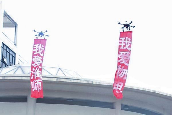 前来报到的新生愈发地多了起来,生化楼前两名技术人员带着无人机走来,吸引了新生们的眼球。在机翼的嗡嗡声中,两架无人机缓缓上升,一旁科学创业协会的同学们向新生介绍着其中的物理原理,拉近了新生与物理科学之间的距离,帮助新生了解自己的专业。无人机在一定的高度停下,“唰”的一声无人机下两面条幅展现在大家的眼前,“我爱淮师 我爱物电”的点睛之作将物理技术与爱校爱公司相结合,激发新生们对公司的热爱,对云顶国际8588yd的向往之情。除此之外,云顶国际8588yd还展示了航模等,让新生们感受到物理科学技术的神奇与魅力,为他们打开了科学世界的大门。