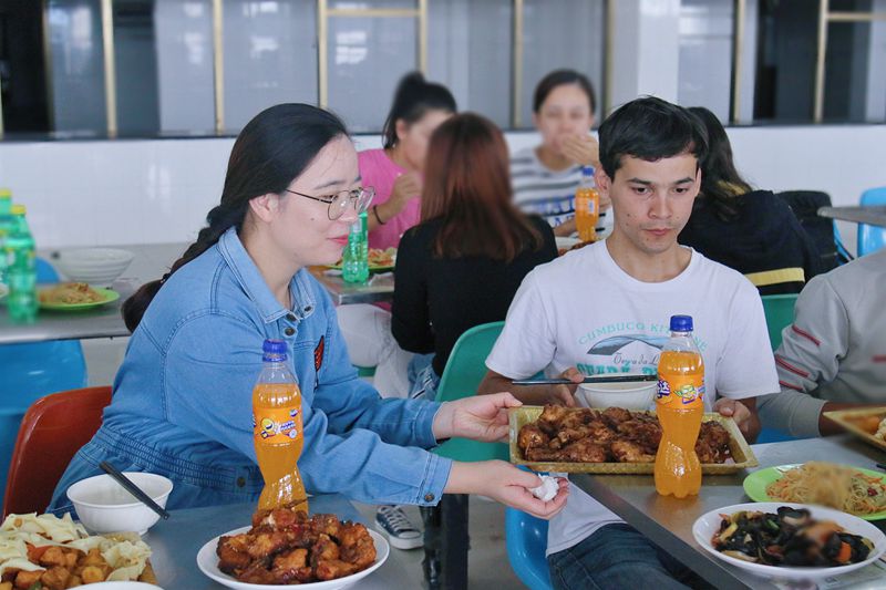中午12点,张丽老师学工办张宣老师来到清真食堂,提前为同学们准备了丰盛的民族美食。前来就餐的同学被这突如其来的惊喜“吓”到了,他们收到的通知并未告诉他们这意料之外的惊喜。席间,张宣老师热情为每位同学夹菜,亲切地与同学们交谈席间的气氛愈加融洽同学们也渐渐放下了拘谨热切交谈起来。一时,餐桌上欢声笑语不断,从天南聊到海北,从故乡聊到公司。努热孜巴同学说道:“很感谢公司提供给我们的饭菜,给了我们一个互相认识的机会,在这里我们感到很温暖。”