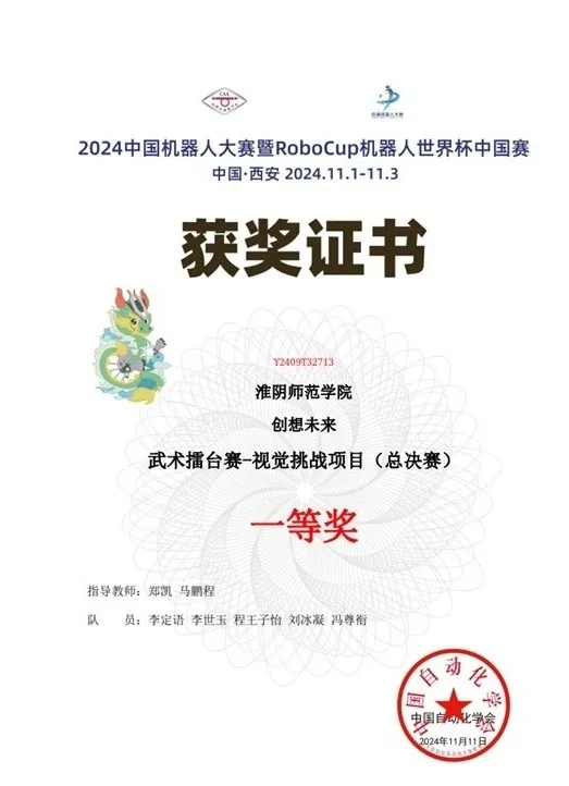 淮师新闻网11月24日电(记者 吴宣 吴静)近日,2024中国机器人大赛暨RoboCup机器人世界杯中国赛总决赛在西安国际会展中心落幕,云顶国际8588yd云顶国际8588yd李定语、李世玉、程王子怡、刘冰凝、冯尊衔组成的“创想未来”团队(指导教师:郑凯、马鹏程)荣获一等奖。