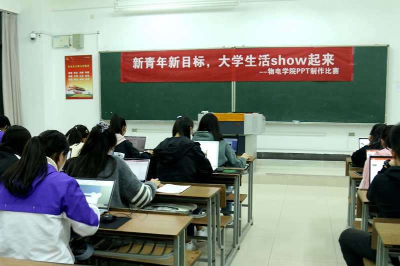 参赛选手在比赛前就精心整理好了自入学以来军训、学习和参与各项活动的照片和视频,为现场的PPT制作做好了万全准备。相关负责人宣布比赛正式开始,各位参赛选手全身心投入,确定好每张幻灯片的内容分布和版面设计;将文字和图片添加、排版;设计幻灯片切换方式……一系列有条不紊的操作后,PPT的大致框架已然形成,有些同学还运用了动画功能等特效,为自己的PPT添上了画龙点睛的一笔。他们用自己的创意思维,创作出了一个个富有深意又独特的画面。