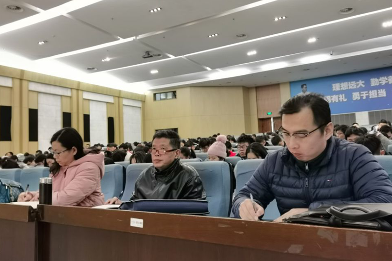 张老师以《从个人发展谈教师专业成长》为题,围绕师范生职业生涯中教学、德育与教科研三个方面进行了报告。胡老师认为,课堂教学是新入职教师首要面对的挑战,必须经历的过程。他鼓励师范生们在站稳课堂、苦练教学基本功的同时,要端正自己的教学态度,做好每一份教案。德育方面,他强调了班主任的重要性,班主任是班级的核心,要树立好的榜样,与新时代教育以“以德树人”为根本任务的理念相契合。他建议走到工作岗位后应经进行教科研工作,以此来丰富精神生活和更新自己的教育理念,做一名敢闯、敢拼、有进取心的教师。