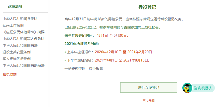 2021年全国征兵网网上登记报名于12月10日开始。全国广大适龄男青年可登录全国征兵网进行兵役登记和应征报名,之后根据兵役机关安排进行实地初审初检。