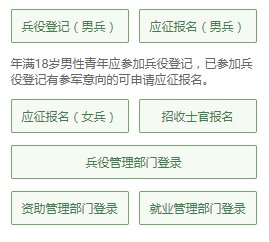 编者语:有些小伙伴看到这么多的菜单就有些懵了,其实不用紧张,如果你是第一次来的男生,直接从“兵役登记(男兵)”进入页面就可以了;否则就从“应征报名(男兵)”进入页面;如果想报名招收士官,就从“招收士官报名”进入页面,不过,今年的招收士官貌似还没开始 -_-!!