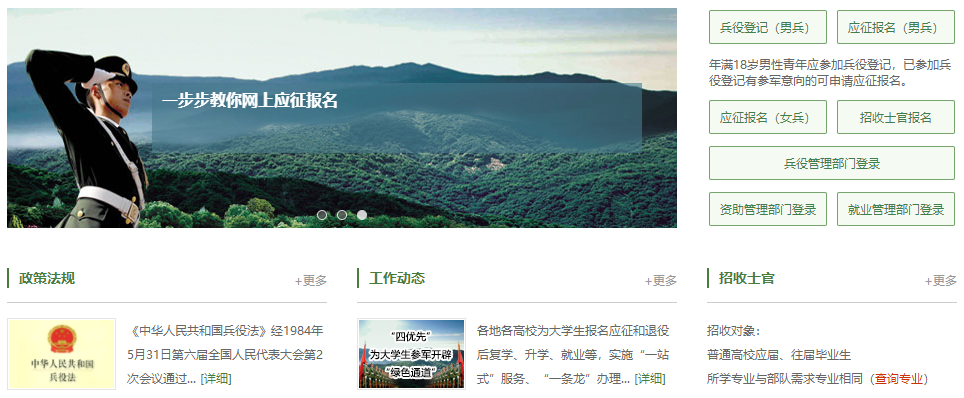 编者语:打开全国征兵网首页,不妨了解下征兵政策和报名条件(例如:报名年龄、身体条件规定等)。
