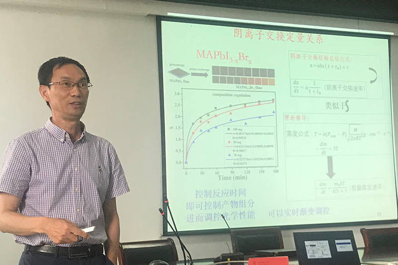 徐春祥教授围绕钙钛矿材料研究热点,从钙钛矿材料的稳定性、光电性能调控及相应的载流子输运动力学等基础而关键的问题讲起,介绍了课题组最新研究成果,提出用水溶液合成方法获得了水氧环境下非常稳定的复合钙钛矿产物;同时设计了一种简便而温和的气/固相阴离子交换策略,并提出了具有普适性的组分调控经验公式,实现了钙钛矿组分及光学性能的原位定量渐变调控;另外,由于材料中的缺陷起源及其对光学性能的影响是一个材料科学领域的关键科学问题,但有关钙钛矿的相关报道莫衷一是,徐教授课题组利用超快光谱技术手段,对材料的表面、体区域中陷阱态介导的发光动力学过程进行的探索研究,并对陷阱态密度进行了定量评估,进而加深了对钙钛矿发光动力学的认识。