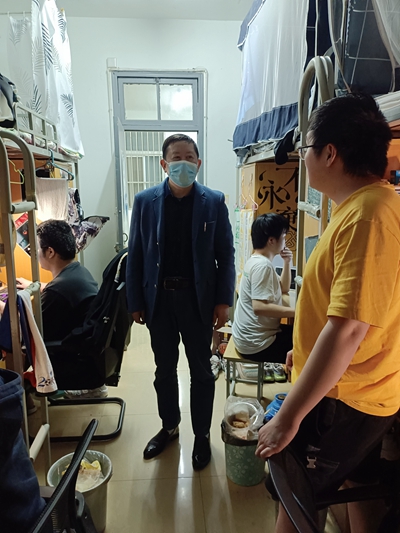 淮师新闻网4月15日电(记者 司成伟 苏彤)为进一步做好疫情防控工作,筑牢校园疫情防控安全线,保障疫情防控期间员工学习、生活平稳有序,4月13日-14日,公司党委书记俞阿龙、经理陈贵宾、副经理孙红兵、马鹏程、党委副书记张丽等公司领导走访联系班级的员工宿舍,了解同学们的学习、生活和思想状况,给同学们送去关心与问候。