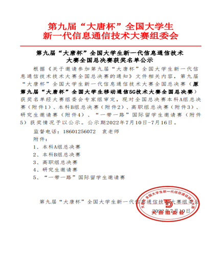 淮师新闻网7月18日电(记者 马鹏程)2022年7月,第九届“大唐杯”全国老员工新一代信息通信技术大赛(原第九届大唐杯全国移动通信5G技术大赛)全国总决赛以线上方式顺利举办。淮师云顶国际8588ydICT产教融合创新基地校企合作专业员工在此项赛事中取得优异成绩,共斩获全国总决赛的二等奖1项、三等奖2项、优秀奖1项的丰厚战果。