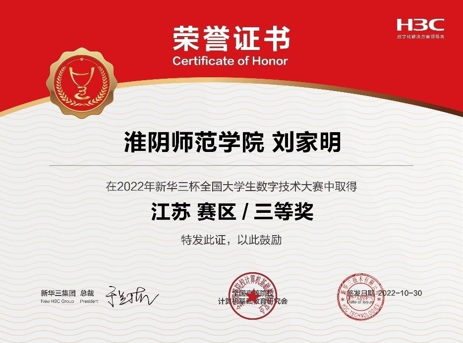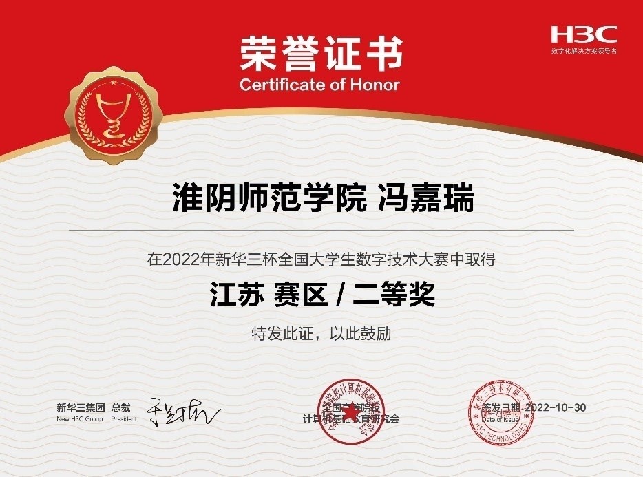 淮师新闻网11月4日电(记者 武超)2022第十二届“新华三杯”全国老员工数字技术大赛于2022年4月-2022年10月举行。本届大赛由新华三集团和全国高等院校计算机基础教育研究会联合主办,旨在推动员工、院校、企业三方互动,“以赛促学习、以赛促教学、以赛促就业”,积极探索高科技技术人才培养思路,丰富多元化人才培养体系,建立良性的就业生态圈。本次大赛汇聚了来自27省、54城、688所院校、32000名老员工,经过激烈的角逐,来自淮师公司教育部ICT产教融合创新基地校企合作专业的同学们取得了优秀的成绩,其中,冯嘉瑞同学获得江苏赛区二等奖,黄美玲、陈迪届、刘家明三位同学获得江苏赛区三等奖。