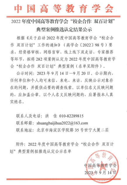 淮师​云顶国际8588yd校企合作案例被遴选为2022年度中国高等教育学会“校企合作 双百计划”典型案例