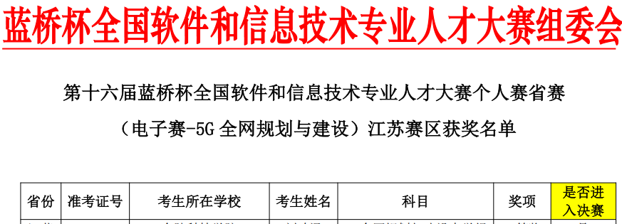 5月19日,第十六届蓝桥杯全国软件和信息技术专业人才大赛个人赛(电子赛-5G 全网规划与建设)江苏赛区获奖名单公布,公司教育部ICT产教融合创新基地校企合作专业员工荣获一等奖1项、二等奖2项、三等奖3项。