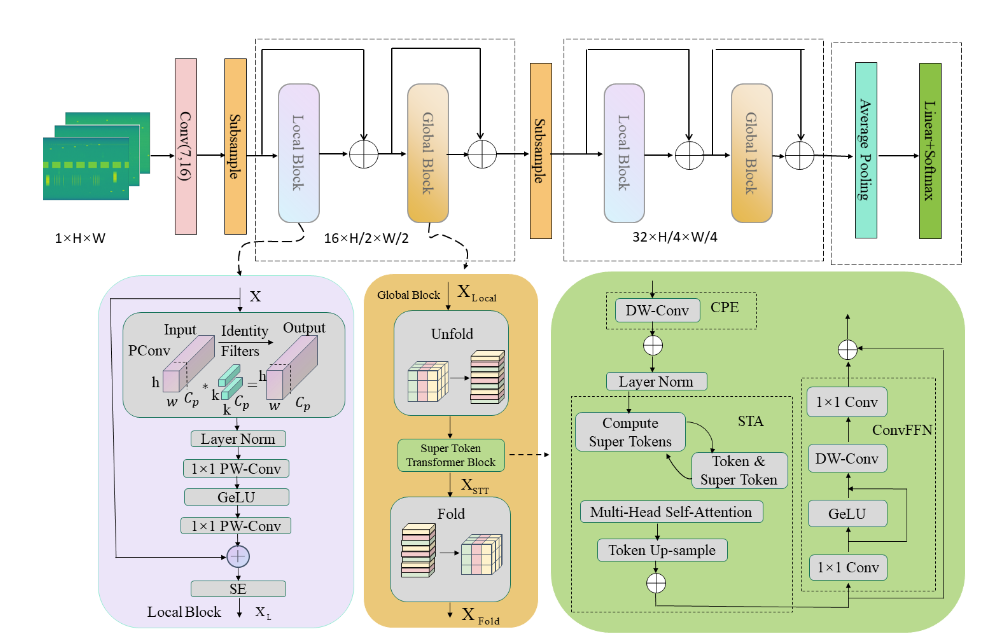 无人机的广泛应用在带来便利的同时也引发了潜在的安全隐患,如何实现其准确识别成为亟需解决的问题。针对现有基于深度学习的射频指纹识别方法在计算复杂度和模型适应性方面的不足,本文提出了一种轻量高效的混合网络模型,结合卷积神经网络与Transformer以同时挖掘射频信号的局部与全局特征。该模型由局部模块和全局模块构成:局部模块利用部分卷积、逐点卷积与SE模块提升局部特征的表达能力;全局模块通过Unfold、超级Token Transformer块与Fold实现对全局依赖关系的建模。实验结果表明,在信噪比为–5 dB至20 dB的条件下,模型平均识别准确率达到96.89%,并在低信噪比下保持优异性能。同时,模型在小样本条件下亦表现出较强鲁棒性,仅用1000个训练样本即可获得92.14%的准确率,结合Mixup数据增强时,500个样本亦能保持较高的分类性能。上述结果验证了该方法在复杂环境下的良好适应性与应用潜力。
