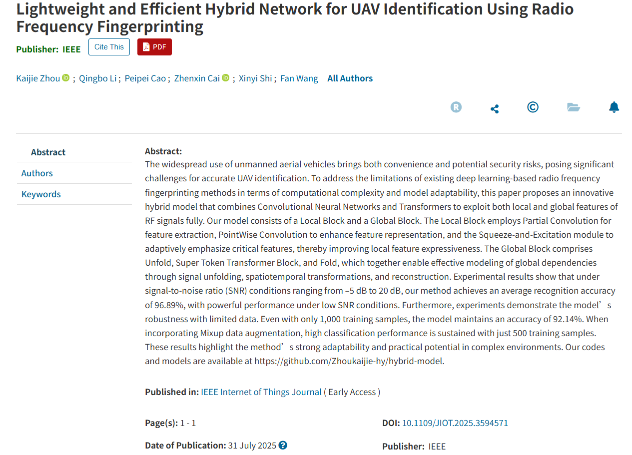 淮师物电新闻网8月20日电(记者 陈友群)近日,周凯杰、李清波、曹培培等老师关于轻量化高效混合网络在无人机射频指纹识别中的应用取得了新研究进展,在《IEEE Internet of Things Journal》期刊上发表题为“Lightweight and Efficient Hybrid Network for UAV Identification Using Radio Frequency Fingerprinting”的学术论文。