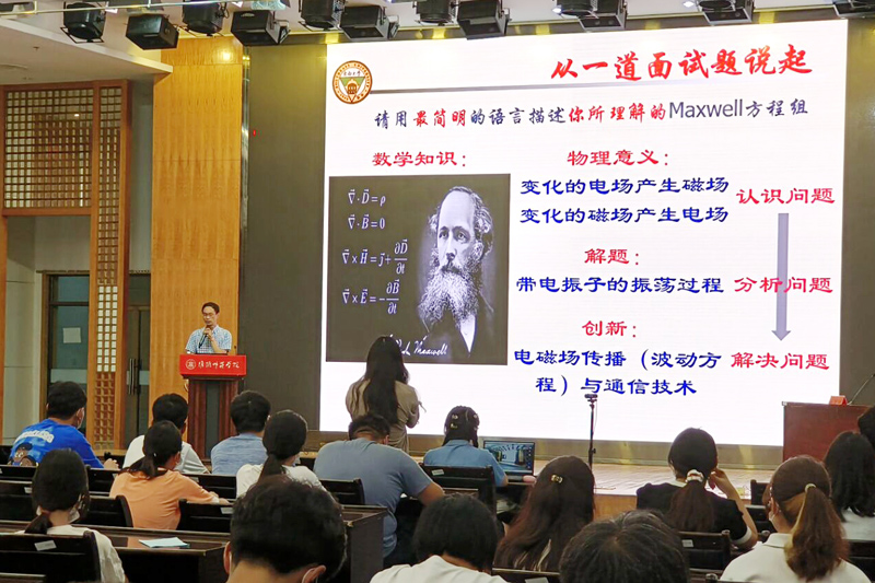 报告会上,徐春祥教授以Maxwell方程组为切入点,从经典物理到量子理论,从基础研究到技术应用,结合自己在纳米光电功能材料与器件等方面的科研工作实践,详细介绍了课题组关于钙钛矿电池和宽禁带半导体氧化锌功能材料与器件方面的最新研究成果。他强调,在科研工作中,问题是导向,概念是基础,创新是出路,并鼓励同学们一定要在学科基础上多下功夫,理解基本概念,打牢理论基础,强化创新思维,为今后的成长成才提供更多的机会与可能。