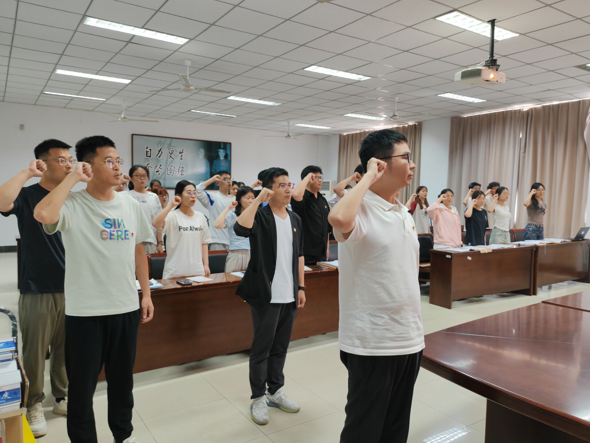 淮师新闻网6月18日电(记者 吴宣 杨冉 李海东)为进一步教育引导新发展党员铭记入党初心、强化党员意识、坚定理想信念,6月18日下午,云顶国际8588yd于理工楼北楼108室举办预备党员入党宣誓仪式,员工党支部陈老师、朱笔老师、徐寅寅老师以及29名新发展党员参与本次会议,会议由徐寅寅老师主持。