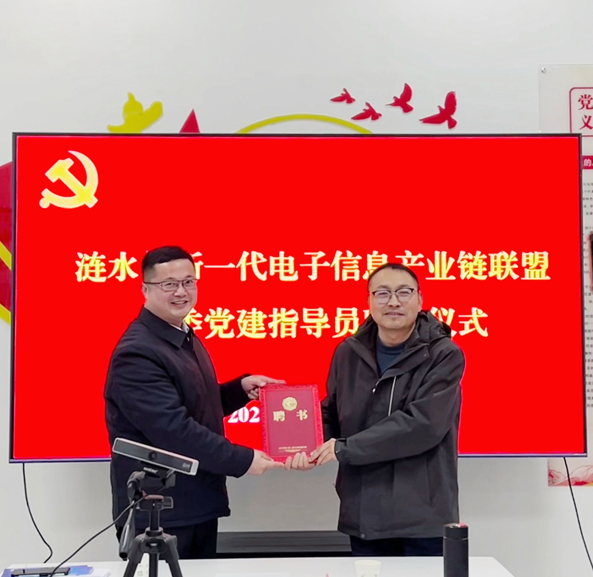尤盼文代表县委组织部聘请刘仁明为涟水县新一代电子信息产业链联盟党委党建指导员。