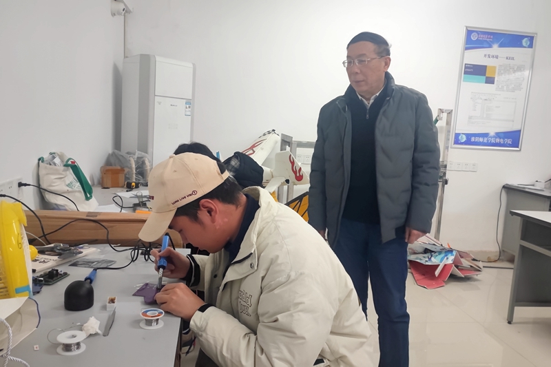 活动开始,社团负责人简瑜江同学向周晖老师介绍了科技协会这一年的发展概况,尤其提到了公司以及对科技与创新创业协会的支持为其注入了源源不断的动力。活动过程中,简瑜江同学带领周晖老师参观了协会近一年所制作的作品,其中无人机的制作工艺和科研成果的保护措施使得周老师记忆犹新。与此同时,科协实验室中社团成员仍在有条不紊的进行学习和科研活动。周晖老师也对社团成员们的专注精神做出了表扬,“好的科技成果需要强大的专注力和追求极致的态度。”