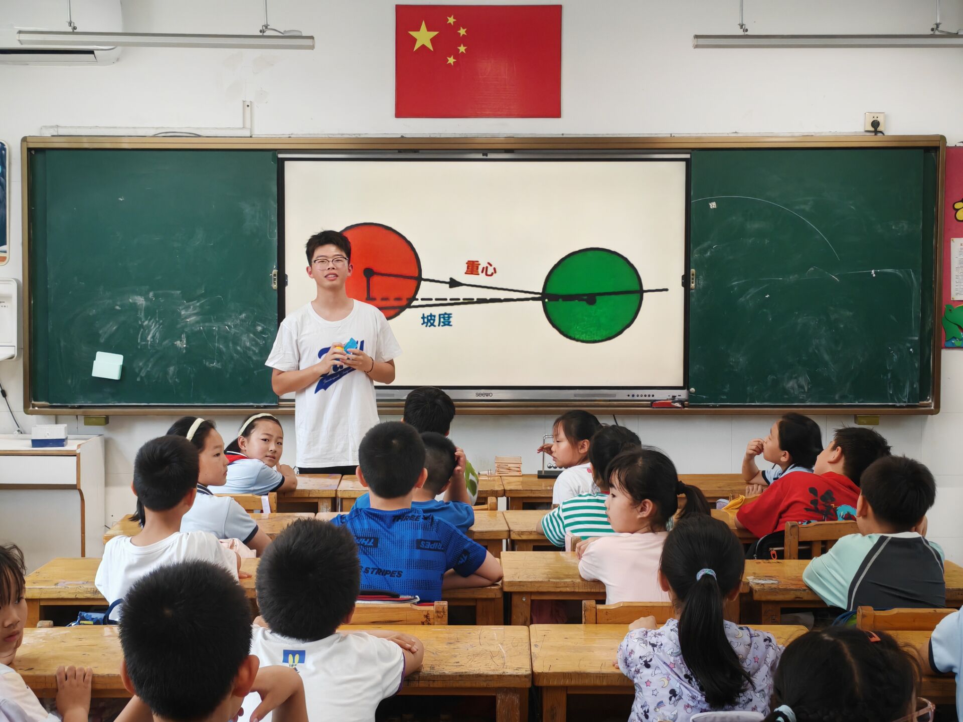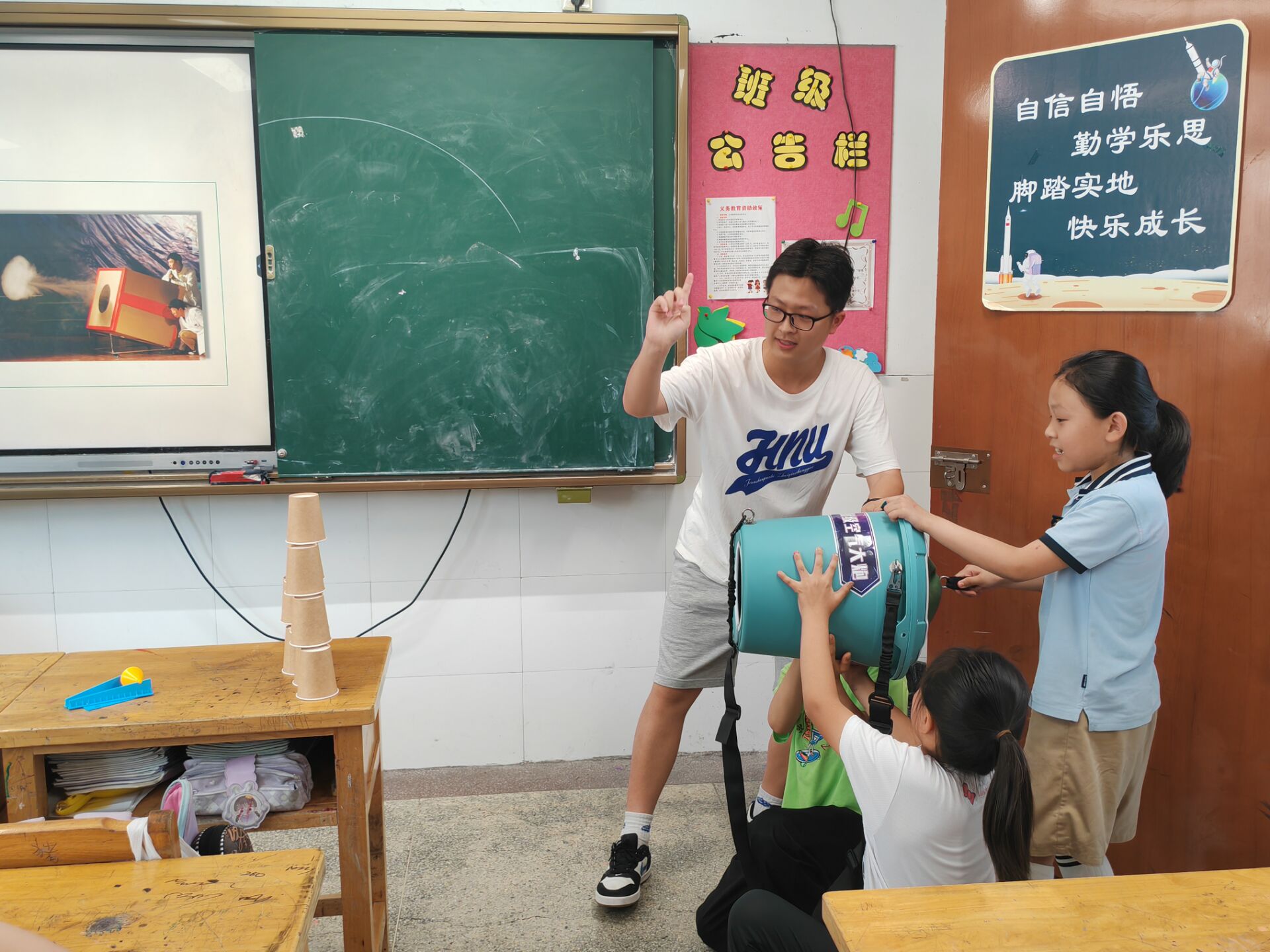 青春科普行,点燃科学梦。“微芒成阳”志愿者团队精心策划了物理科普课堂,他们凭借丰富的专业知识,携带教学仪器,深入小学课堂,以个性化的课堂设计向低年级小朋友们普及物理知识。为了更好的让小朋友们深入理解其中的原理,志愿者们邀请几位同学上台做一些神奇的物理实验,神奇的实验使小朋友们争先恐后的举手,其中“空气炮”的演示装置令小朋友们叹为观止。牛顿摆和纸杯传音的实验仪器也让他们领略了物理实验的魅力。