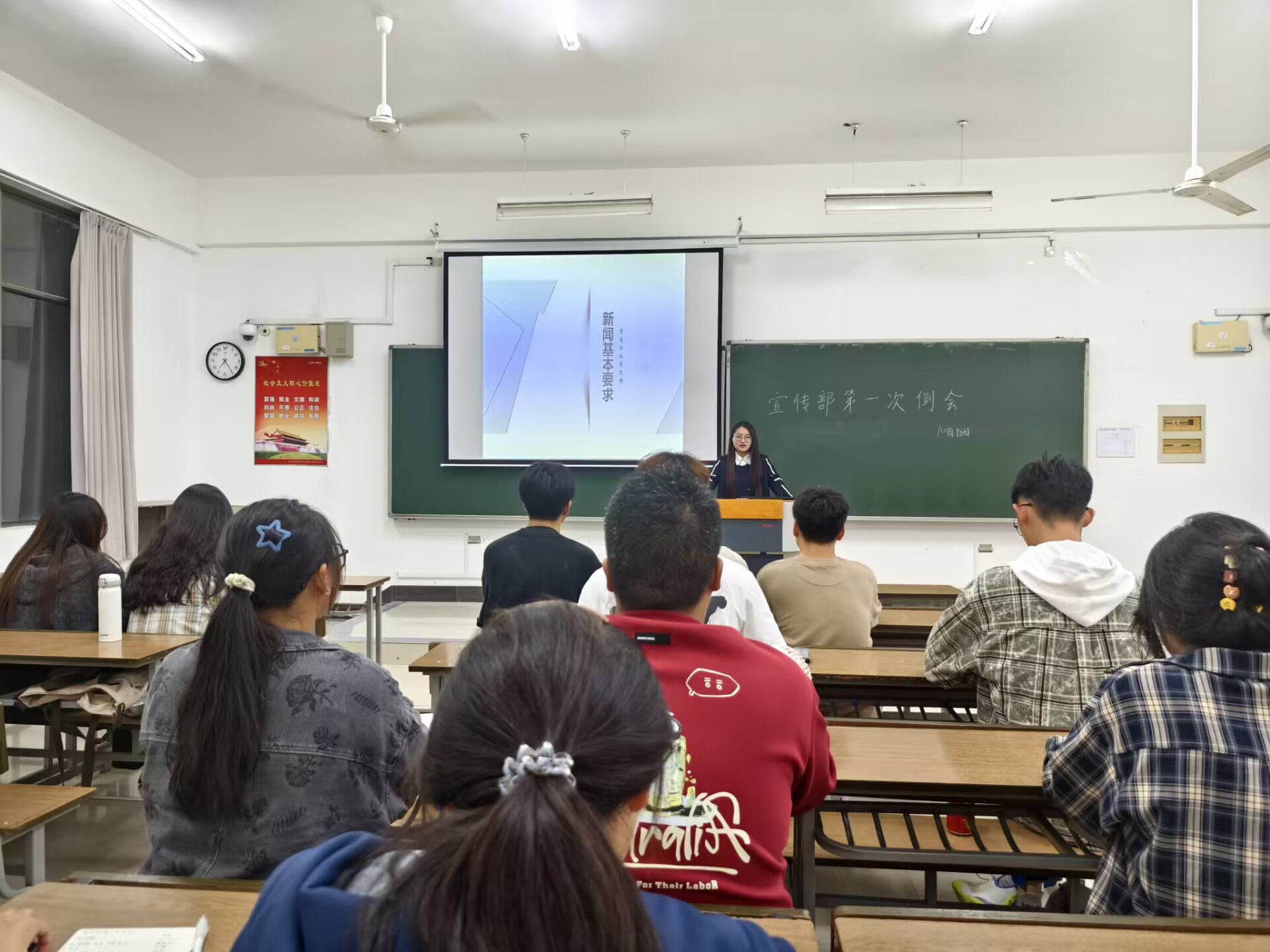 会议开始,新成员们轮流进行了自我介绍,接着杨冉同学分别从新闻的来源、发布平台、新闻要素以及新闻流程四个方面介绍了新闻部的基本要求和具体工作,并着重强调了新闻稿的格式规范及其他注意事项。此外,杨同学还向新成员们传授了如何高效率完成新闻稿的撰写任务以保证新闻时效性的经验。接着,宋逯豪同学向大家介绍了新媒部的具体工作,并通过实际操作,演示了微信公众号推文的制作过程,使新成员们对宣传工作有了更直观的认识。随后,李同学讲述了宣传部的评分细则和平时的工作要求,确保新成员对部门工作有清晰的理解。最后,吴静同学对本次例会进行了补充,她指出,新闻照片的拍摄并非易事,并鼓励新生干事们要善于寻找好合适的角度,掌握相机的曝光技巧,以便拍出满意的照片。