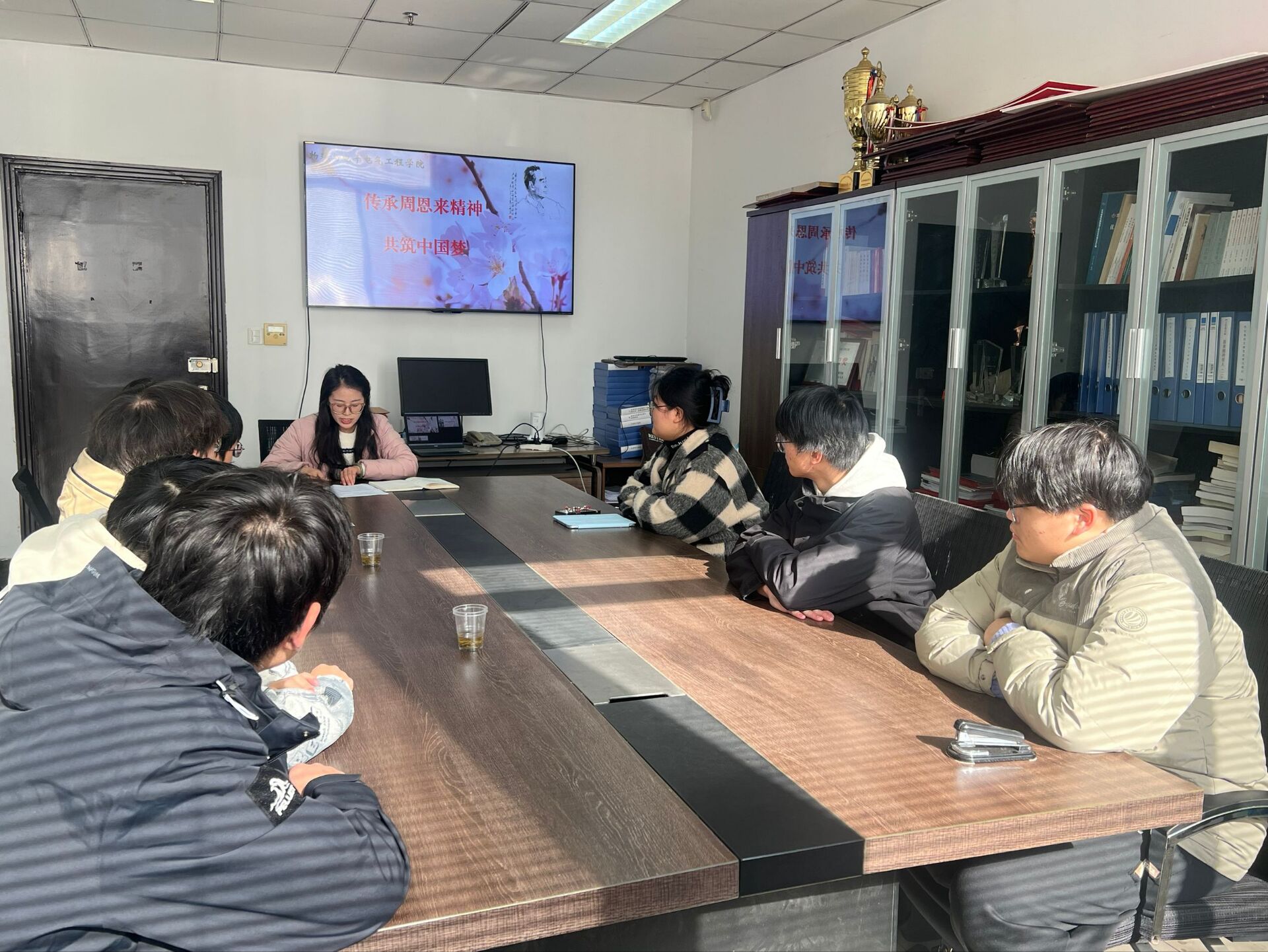 在活动伊始,王老师深刻阐述了周恩来精神的五个方面:“一心为民、对党忠诚、勇于担当、顾全大局、严于律己”。她强调,周恩来精神是中华民族优秀文化传统与崇高共产主义理想的结晶,是共产党人理想信念的生动体现,也是当代中国精神的集中展现,具有不朽的价值。随后,活动进入“周恩来故事分享”环节。同学们热情高涨,积极参与,讲述了“周总理对革命事业的严谨态度”、“周总理对爱情的忠贞不渝”以及“周总理与人民群众的深厚感情”等故事。这些故事让同学们对周总理的伟大人格有了更深刻的认识,并在分享中传承了周恩来精神。活动最后,全体参与者通过短片回顾了周总理辉煌的一生。短片结束后,大家纷纷表达了对周总理的敬仰和感激之情,深切体会到了他全心全意为人民服务的精神。在这种精神的感召下,同学们更加坚定了自己的青春梦想,立志将周恩来精神发扬光大,在新时代的征程上砥砺前行。
