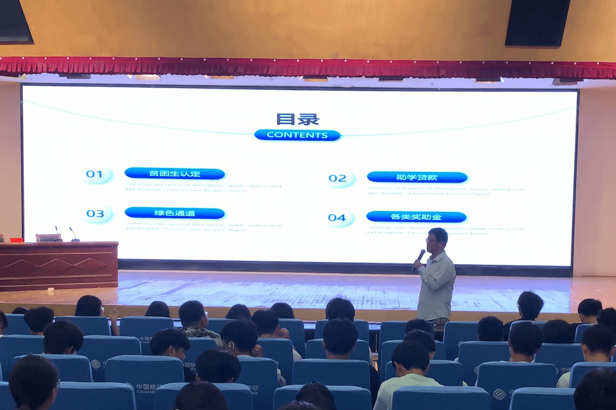在介绍公司资助政策时,包老师从贫困生认定、助学贷款、绿色通道和各类奖助学金四个方面分别讲解。包老师鼓励符合条件的同学积极申请,不要因顾虑而错失机会。