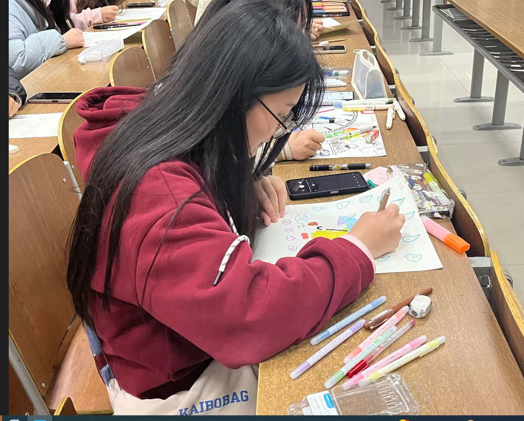 活动之初,相关人员引导同学有序就坐,安排同学们进行主题抽签并绘制。活动形式为两人一组,开场组合成员进行独立绘制,赛事进行10分钟后,小组成员之间进行第一轮交换,由对方完善自己的作品。最后,作品归还自己,两名成员合作共同完成两幅作品。