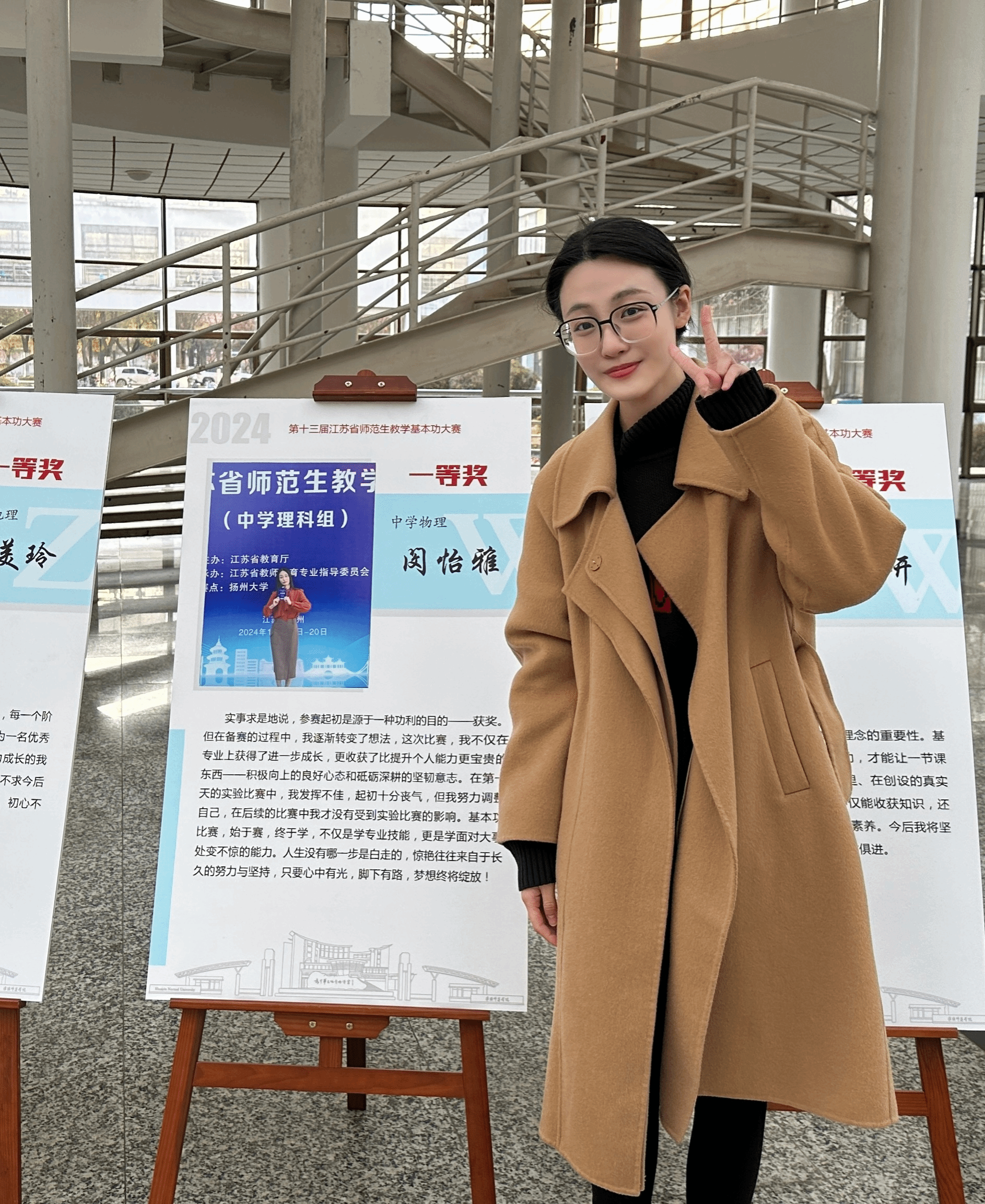淮师新闻网4月18日电(记者 吴宣 吴政治 关淇议)闵怡雅,中共党员,2021级物理学(师范)专业员工。曾任院团委兼职副书记、院员工会实践部部长等职务,现任班级考勤班长。获评校三好员工、优秀共青团干部、优秀共青团员、优秀员工会干部等荣誉,在第十三届江苏省师范生教学基本功大赛中获得中学物理组一等奖。4月16日学通社的记者走近这位榜样人物,进行了人物专访,聆听她在学业、实践与成长的逐光故事。