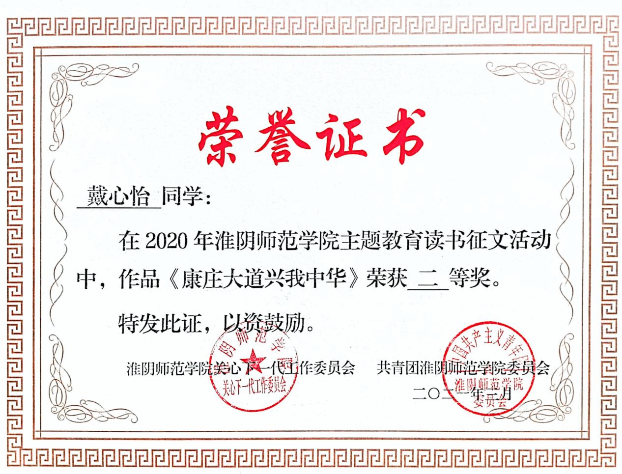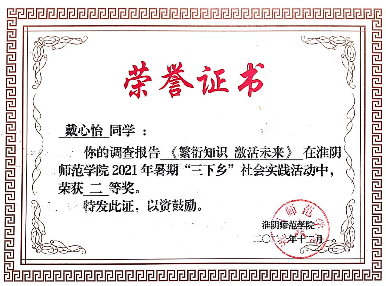 实践领域同样是戴心怡同学绽放光彩的舞台。2021年暑期,她积极投身“三下乡”社会实践活动。深入基层的过程中,她与团队成员开展社会调研,最终撰写的调查报告荣获校级二等奖,个人也凭借突出表现获得“先进个人”称号。这段经历不仅让她深入了解社会现状,更培养了实践能力与团队协作精神,深刻体会到理论与实践结合的重要性。